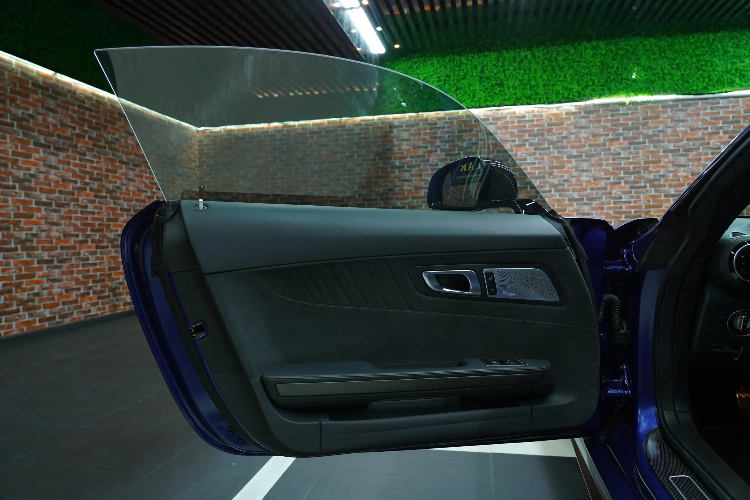 Carbon fiber elements are used extensively in the exterior design, including the roof, side mirrors, and various aerodynamic components.