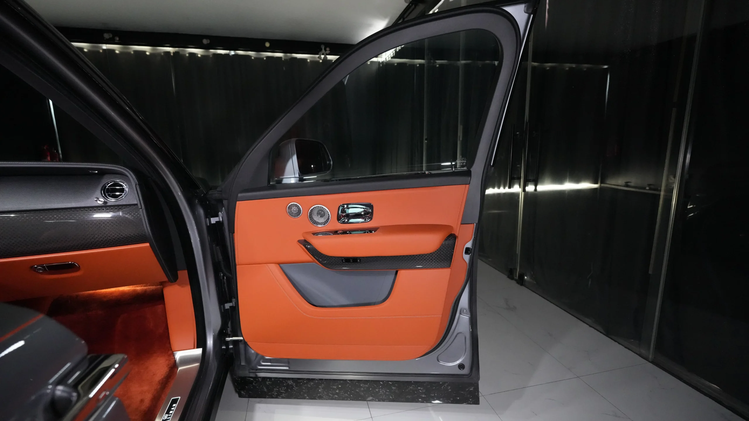 Exterior Design: The Cullinan Black Badge Onyx Edition boasts an imposing presence with its bold design cues. Finished in Jubilee Silver, this color option exudes elegance and sophistication, complemented by the distinctive Black Badge styling elements such as the darkened chrome trim, black Spirit of Ecstasy hood ornament, and blacked-out grille.