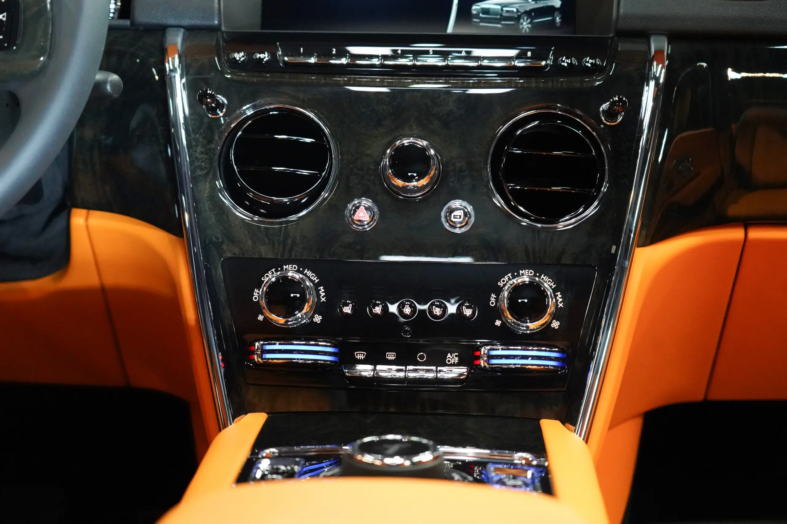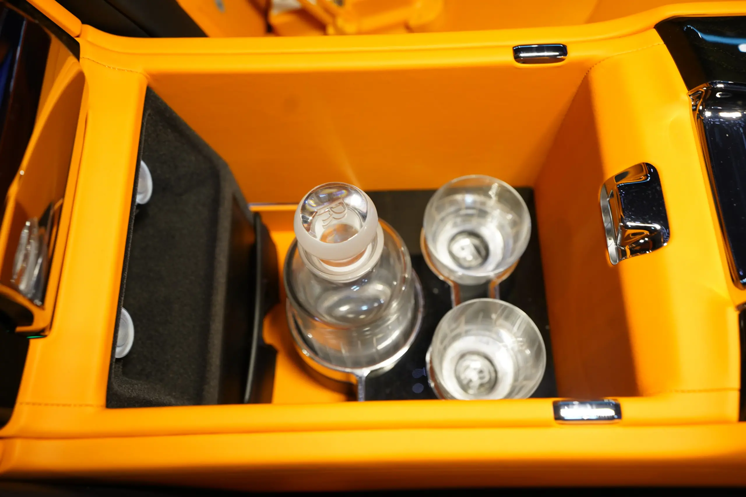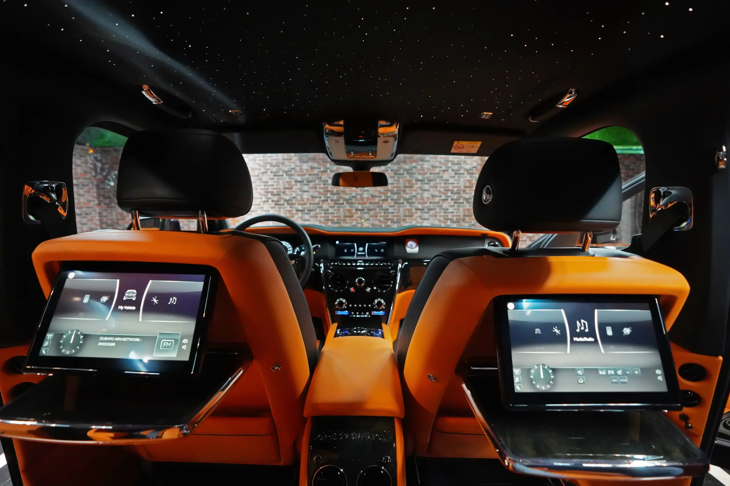 Step inside the Cullinan Onyx Concept, and you're greeted by an interior that contrasts beautifully with the exterior. The vibrant Orange leather upholstery is not just striking but also exquisitely crafted. Every seat, panel, and surface is wrapped in the finest leather, with meticulous attention to detail in the stitching and finishing. The color scheme adds a lively, modern twist to the classic luxury of the Cullinan, creating an environment that is both bold and inviting.