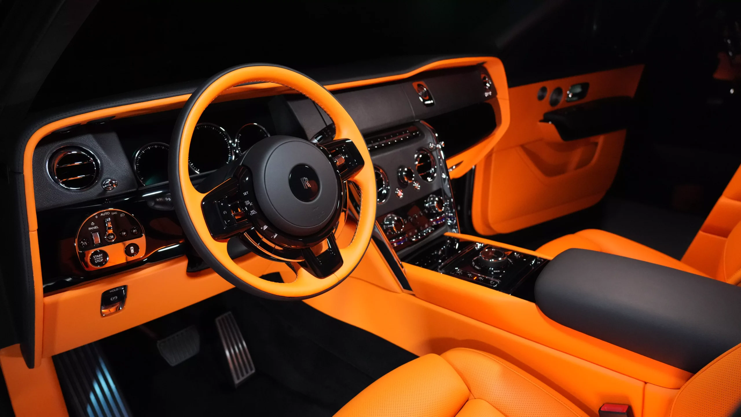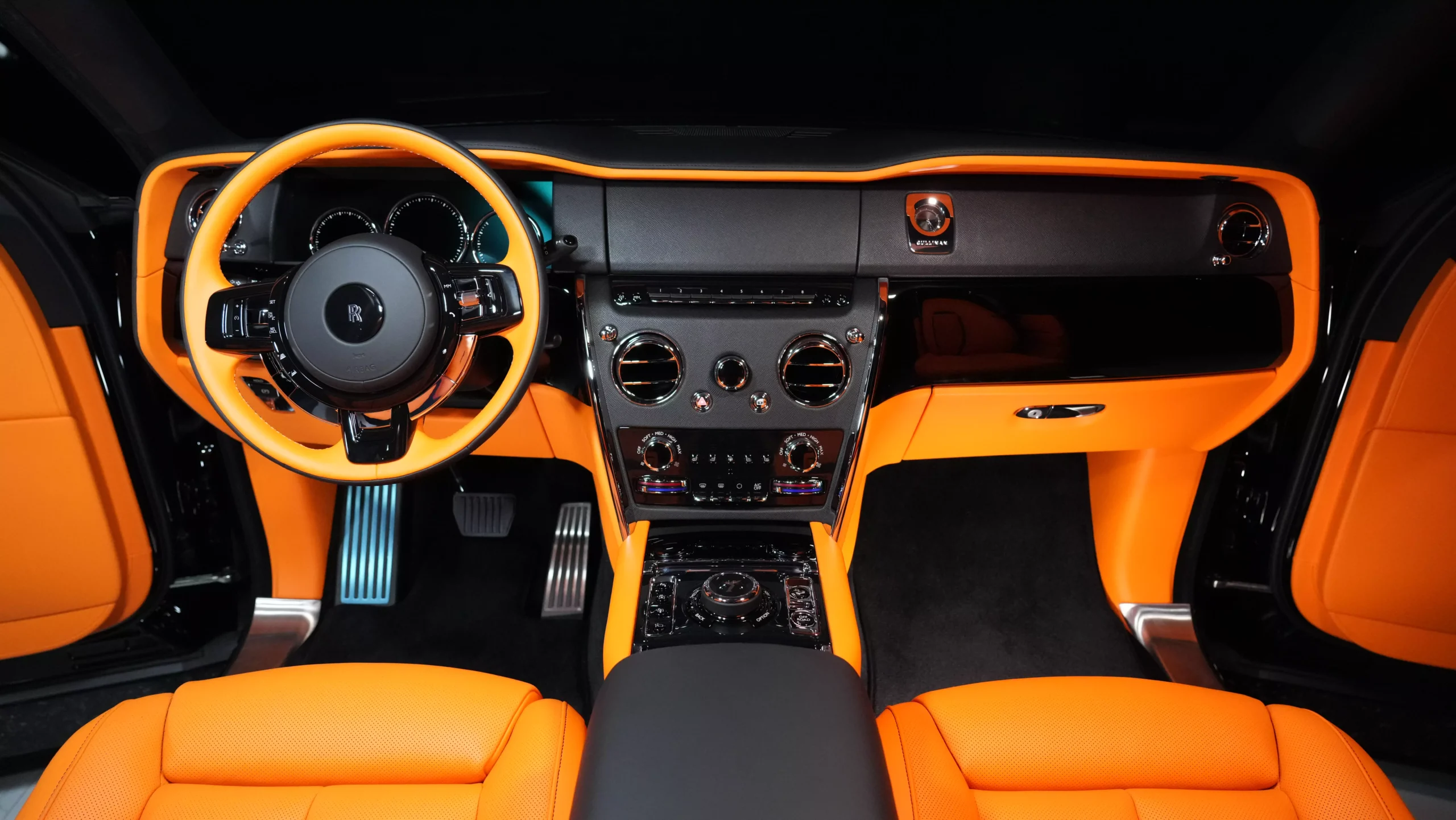 The Rolls Royce Cullinan Onyx Concept in Diamond Black with an interior featuring Orange accents is a bespoke and luxurious interpretation of the already opulent Cullinan SUV. Here’s an overview: